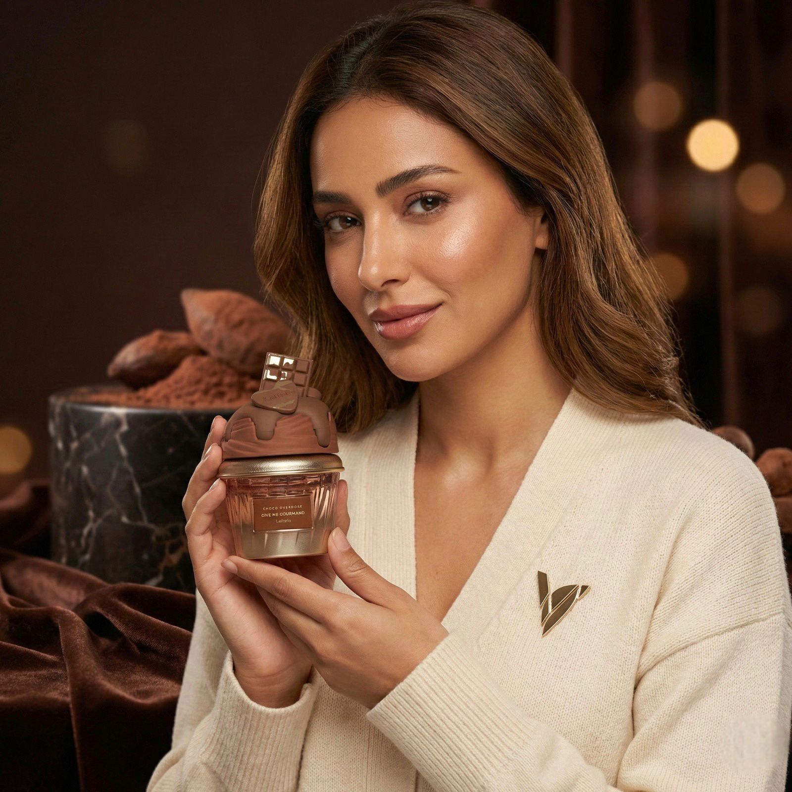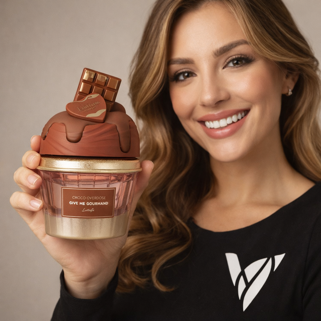 Lattafa Choco Overdose (Give Me Gourmand) EDP 75 ml huele a postre de chocolate intenso: abre como fudge de chocolate oscuro bien denso, luego se vuelve aún más “panadería” con cacao y un acorde de cupcake esponjoso, y termina en una base dulce y cremosa de vainilla y caramelo con un toque balsámico de benjuí que deja una estela gourmand adictiva y reconfortante.