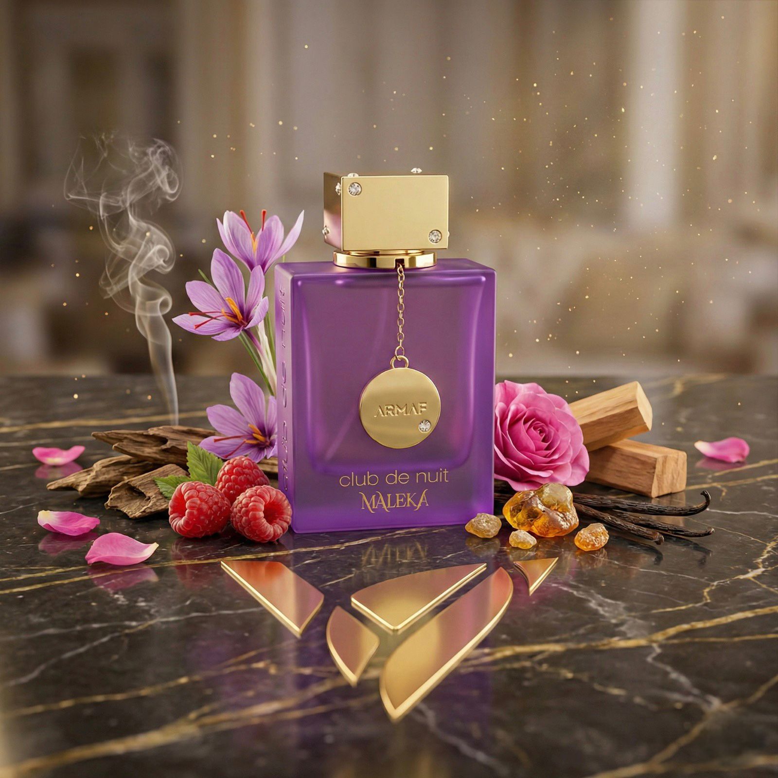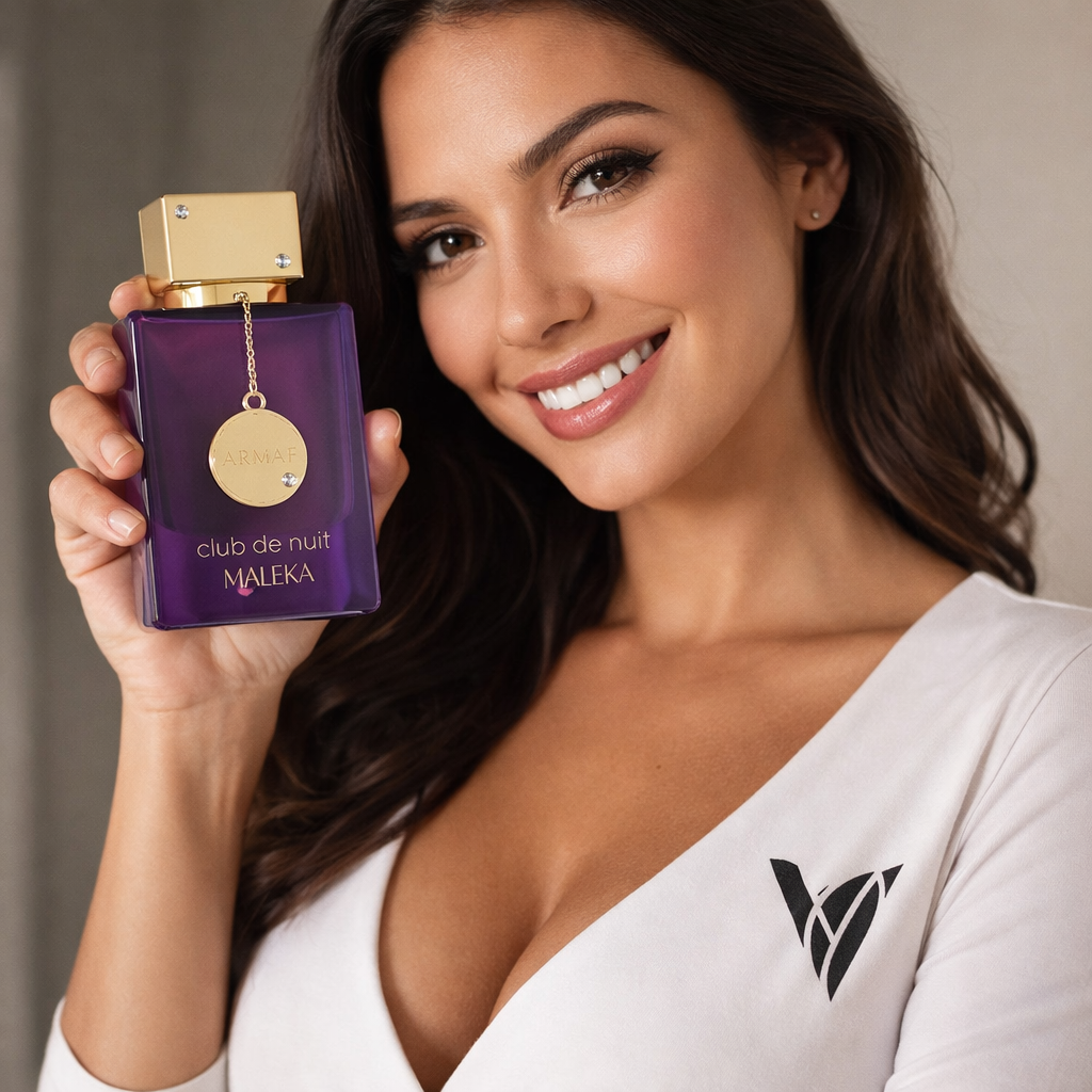 Club De Nuit Maleka de Armaf (EDP 100 ml) huele frutal–floral elegante y cremoso: abre brillante con lichi jugoso, un toque cítrico de bergamota y el picante suave de pimienta rosa; en el corazón se siente aterciopelado y sofisticado por el iris (orris), y al final queda una estela gourmand y moderna de praliné dulce con sándalo cremoso y ambroxan limpio, perfecta para noche o clima fresco.