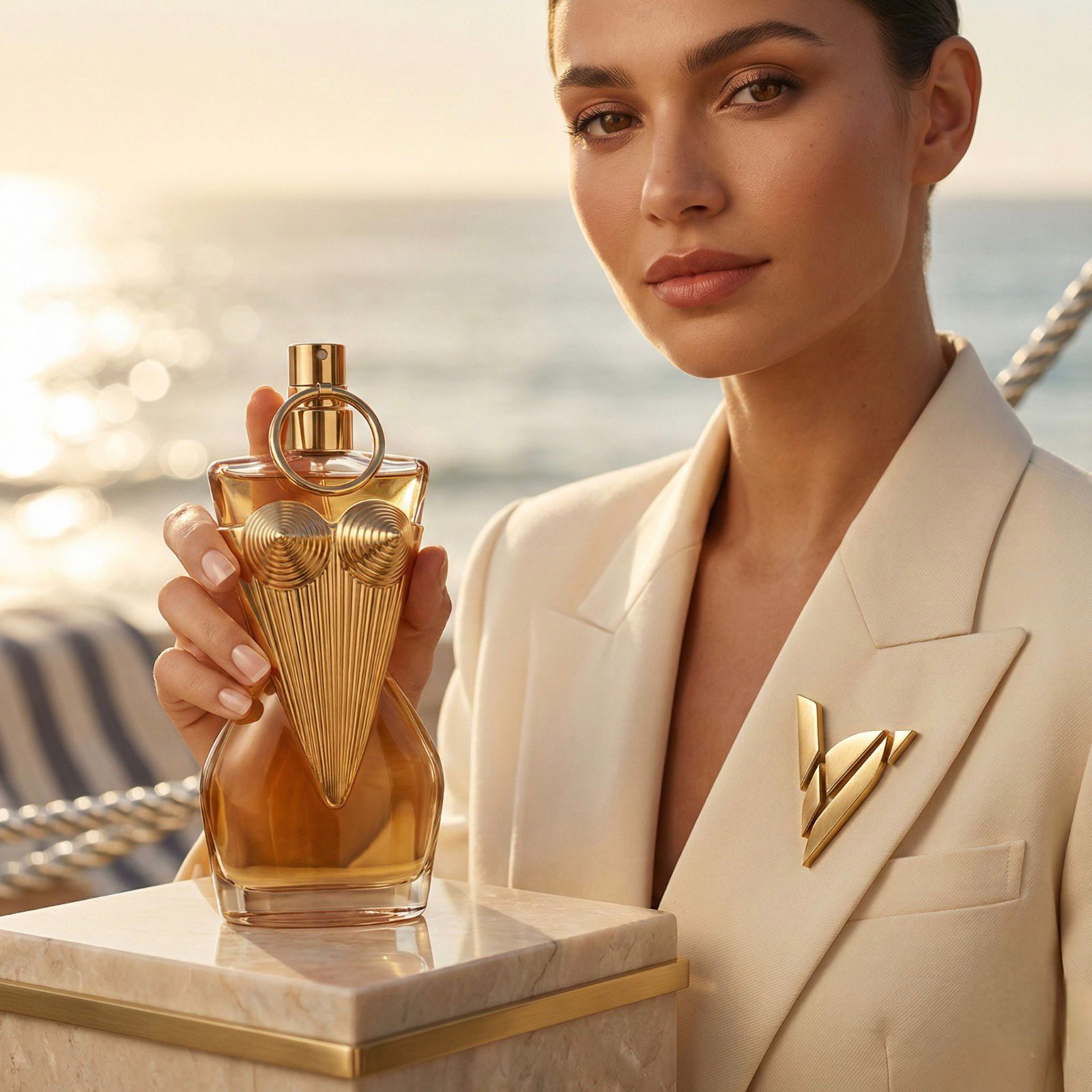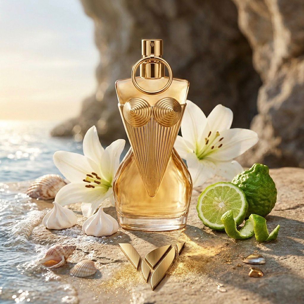 Gaultier Divine de Jean Paul Gaultier (EDP) es un perfume solar y floral gourmand con un giro marino-salado: abre luminoso y jugoso con bergamota, un acorde acuático tipo Calypsone y frutos rojos, luego se vuelve elegante y cremoso con lirio, ylang-ylang y jazmín, y termina adictivo con una base de merengue (dulce y aterciopelado), almizcle y patchouli, dejando una estela femenina, brillante y muy moderna.