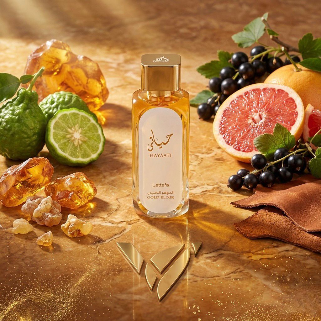 Lattafa Hayaati Gold Elixir EDP 100 ml es un perfume unisex con un aroma cítrico–gourmand y elegante: abre fresco y brillante con bergamota, toronja (pomelo) y cassis; luego se vuelve más intenso y seductor con un corazón de cuero suave, durazno jugoso y un toque especiado de azafrán; y seca cálido y adictivo con vainilla, ámbar, almizcle y vetiver, dejando una estela dulce-ambarada con fondo limpio y sofisticado.
