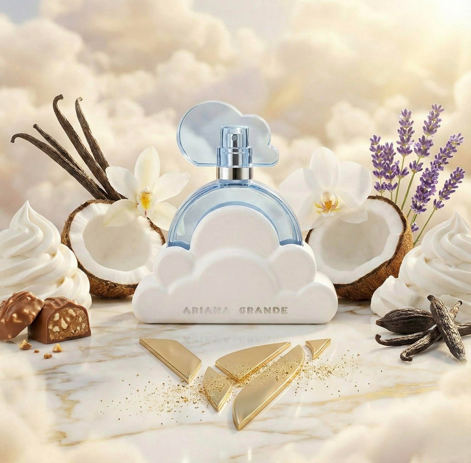 El perfume "Cloud" de Ariana Grande es conocido por su aroma dulce y celestial. Combina notas de bergamota, lavanda, pera, coco, praliné, vainilla y almizcle. El resultado es una fragancia suave, acogedora y reconfortante, con un toque juguetón y femenino.
