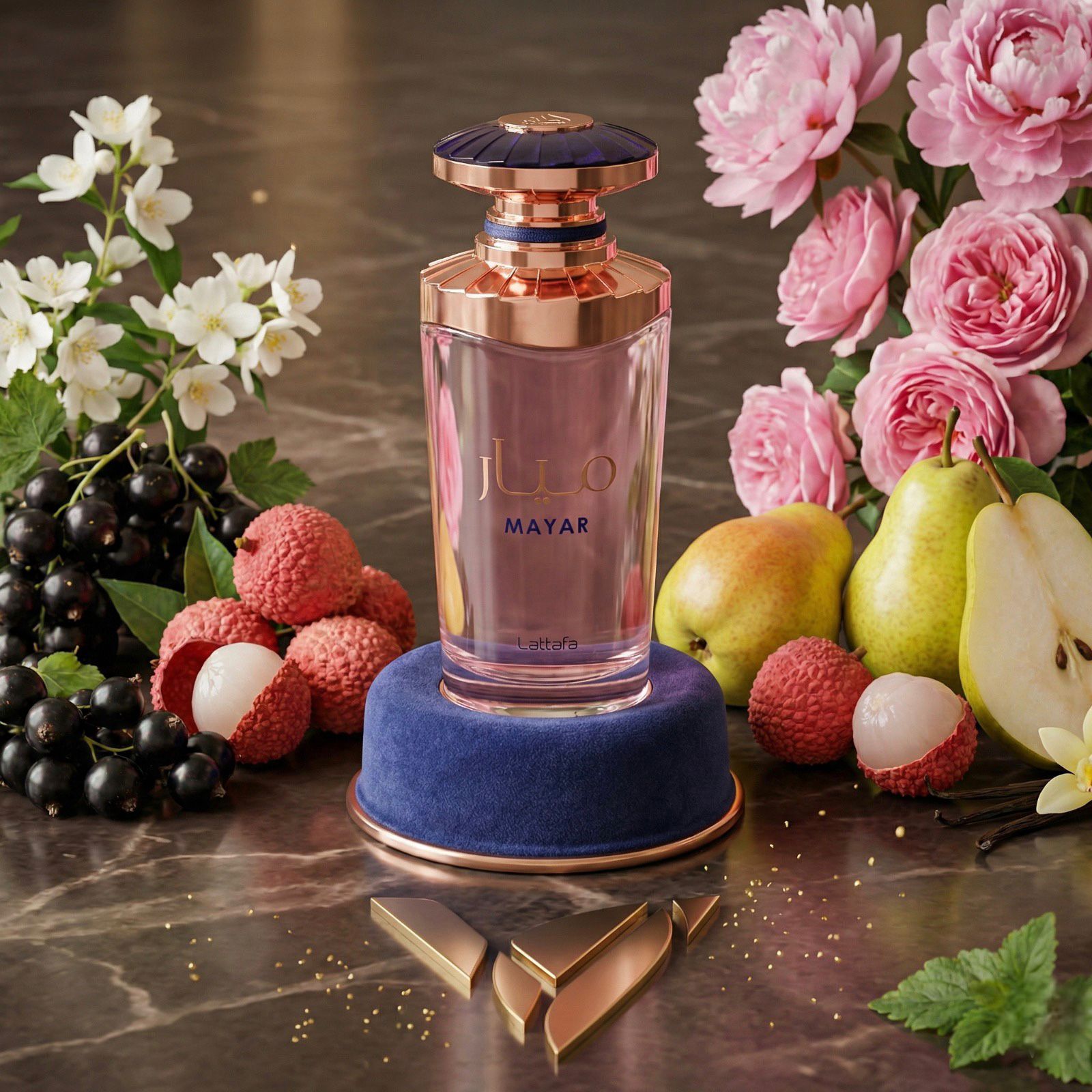 Lattafa Mayar EDP 100 ml es un perfume floral frutal dulce y femenino: abre jugoso con lichi y frambuesa con un toque verde de hoja de violeta, luego se vuelve más elegante y suave con un bouquet de peonía, rosa blanca y jazmín, y termina con una base cremosa y limpia de vainilla y almizcle que deja una estela delicada, coqueta y muy fácil de usar a diario.
