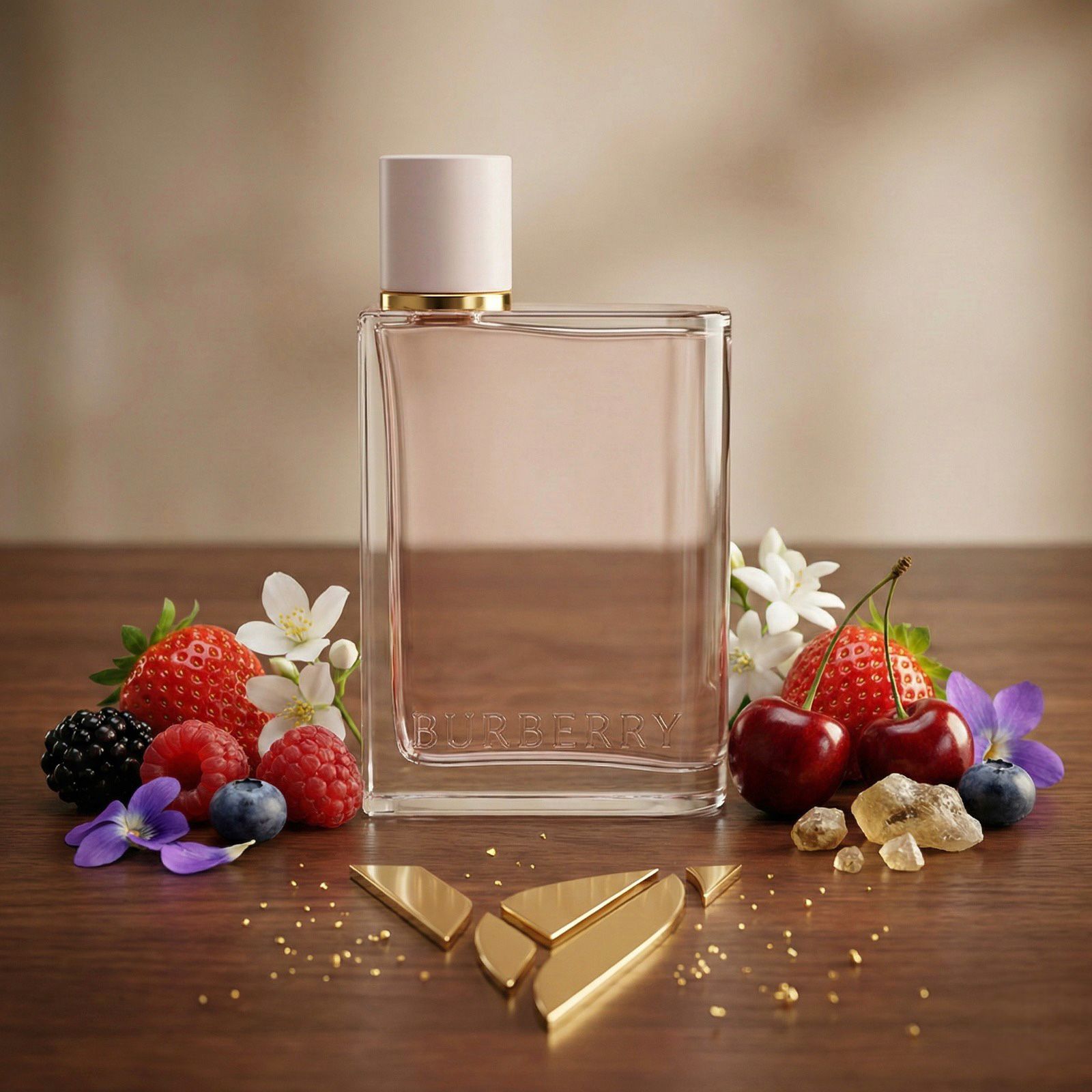 Burberry Her (EDP) 100 ml huele a un coctel de frutos rojos súper jugoso y dulce: abre con fresa, frambuesa, mora y cereza con un toque cítrico, luego se suaviza con un fondo floral limpio de jazmín y violeta, y termina cálido y cremoso con almizcle, vainilla, ámbar y maderas (tipo cashmeran), dejando una estela femenina, moderna y “gourmand” sin ser pesada.