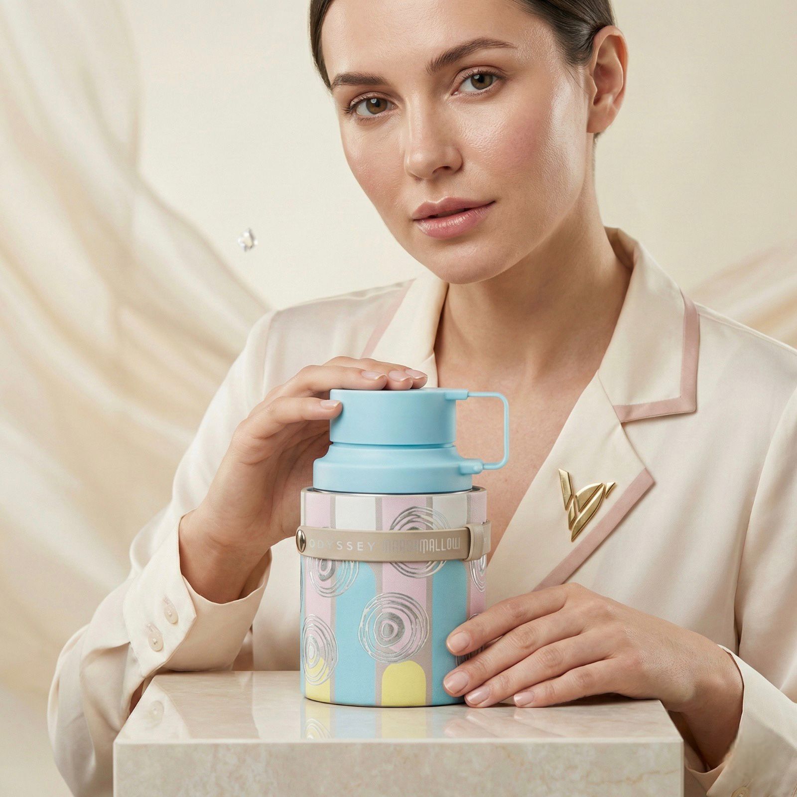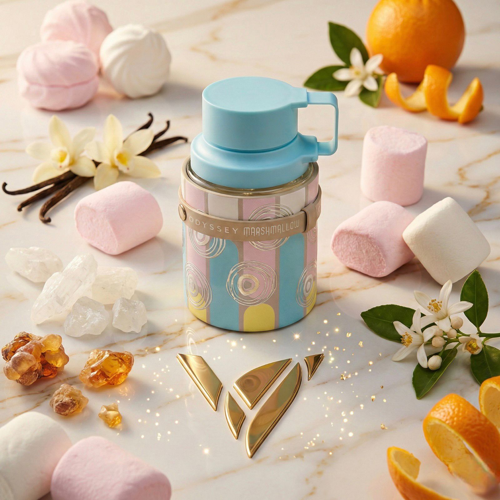 Armaf Odyssey Marshmallow EDP 100 ml huele a un gourmand frutal-cremoso tipo postre: abre jugoso y fresco con coco, manzana y limón sobre un toque floral suave (peonía y lirio del valle), luego explota una “nube” dulce de malvavisco con fresa, durazno, albaricoque, frambuesa y flor de azahar, y termina súper adictivo y cremoso con mascarpone, praliné, vainilla, almizcle, haba tonka y ámbar, dejando una estela dulce, suave y reconfortante.